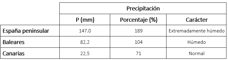 Octubre fue extremadamente húmedo en la Península, húmedo en Baleares y normal en el archipiélago canario. Las lluvias estuvieron en general muy repartidas por todo el territorio a lo largo del mes. Entre los mayores acumulados diarios destaca, en las estaciones de la red principal, Jerez de la Frontera (Cádiz) con 116 l/m², récord de una serie iniciada en 1946. En cuanto a los valores mensuales, Vigo/aeropuerto acumuló 413 l/m². Jerez de la Frontera, con 315 l/m², batió también su récord mensual.