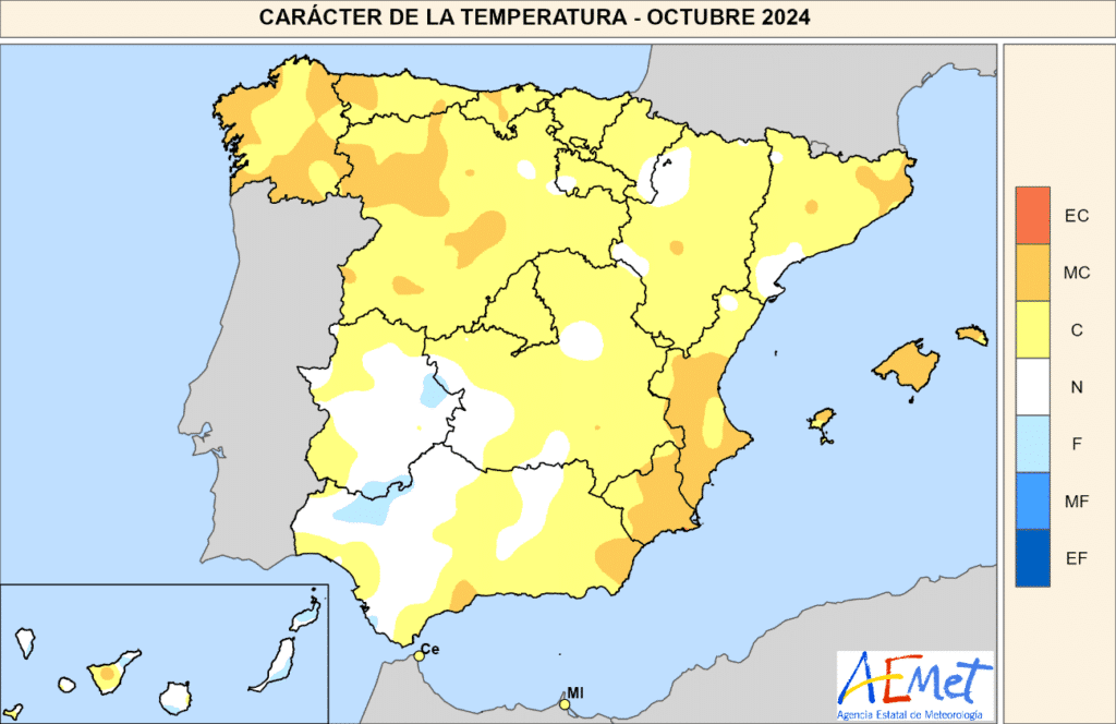 El mes de octubre fue muy cálido en el noroeste y en el sureste de la España peninsular, normal o frío en el suroeste y cálido en el resto de las zonas peninsulares. En Baleares fue muy cálido, mientras que en Canarias tuvo un carácter muy variable de unas zonas a otras, resultando en conjunto normal.