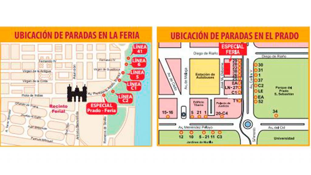 Las líneas con itinerario especial desde el Prado hasta la Feria son: C1, C2, 3, 5, 6, 10, 11, 12, 15, 16, 20, 21, 22, 25, 26, 27, 28, 29, 30, 31, 34, 37, 38, 41, 52