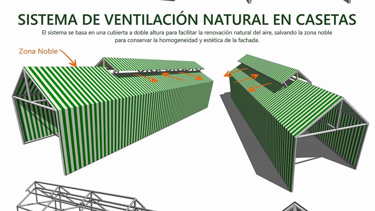 Toda la zona del techo de la trastienda quedará abierta (con cubierta a dos aguas), lo que permitirá la ventilación del aire de las casetas pero, al mismo tiempo, que no entre el agua en caso de que llueva. Por otro lado, al ser en la zona de la trastienda y no en «la noble» –que tiene más aireación al tener la apertura delantera y puertas– desde la línea de fachada no se observa la elevación que se le va a dar a las casetas.