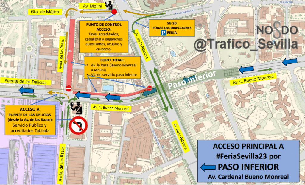 Para ello, en primer lugar se habilitará el giro a la izquierda desde la Avenida de las Razas en sentido hacia el Puente de las Delicias solo para vehículos de servicio público y acreditados de Tablada. El acceso al Puente de las Delicias para el resto de vehículos se realizará exclusivamente a través del paso subterráneo de Cardenal Bueno Monreal. En este itinerario, Movilidad va a incrementar el control del tráfico a través de cámaras para posibilitar la fluidez de la circulación.