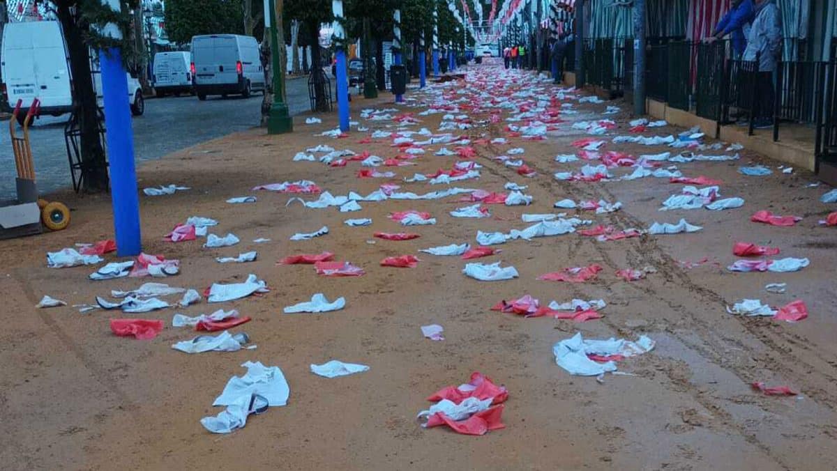 La imagen que la lluvia ha dejado ha sido la de cientos de farolillos tirados en el suelo y el albero de la Feria de Sevilla convertido en un barrizal. Según la Agencia Estatal de Meteorología (AEMET), no se esperan más precipitaciones para la Feria de Sevilla, por lo que aquellos que vayan a asistir no deben temer por mojarse. Se espera que los cielos se encuentren completamente despejados para el mediodía.