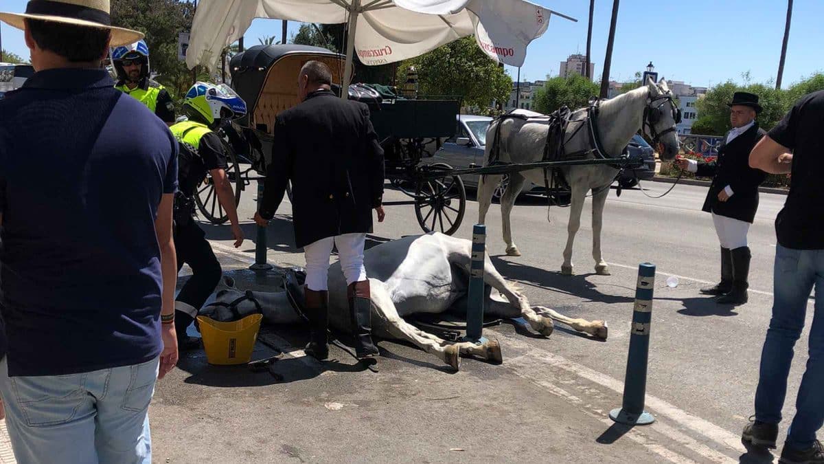El Partido Animalista PACMA ha alertado de la muerte de un caballo durante la tarde de este miércoles mientras tiraba de un carruaje en la Feria de Abril de Sevilla. Un vídeo publicado por la página «Rescate de Aves» y difundido en las redes sociales muestra cómo el animal se desplomó y comenzó a hiperventilar mientras era rodeado por cocheros y viandantes. Según los animalistas, algunos testigos de la zona afirman que, minutos después, fue tapado con una manta y retirado de la vía pública.