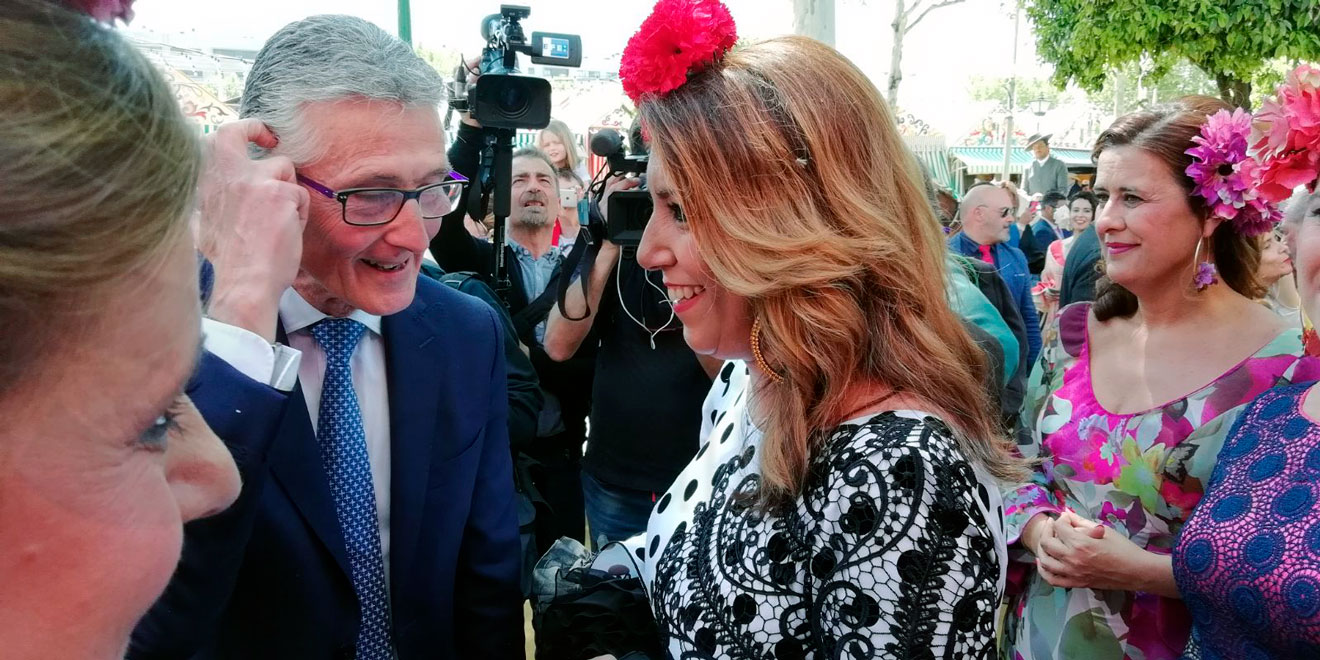 El acto organizado por la Asociación de la Prensa de Sevilla ha congregado a multitud de periodistas y profesionales de la comunicación en la caseta de la asociación de la calle Juan Belmonte, y ha contado con la presencia destacada de la presidenta de la Junta de Andalucía, Susana Díaz, y el secretario general del PSOE, Pedro Sánchez.