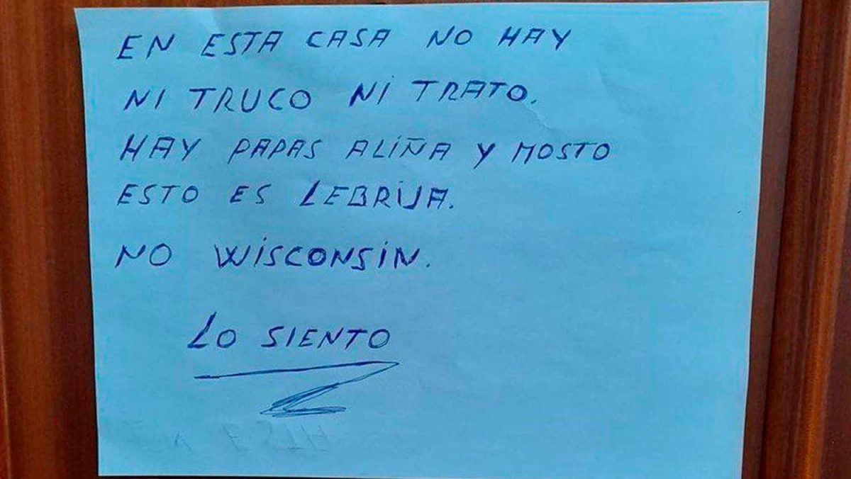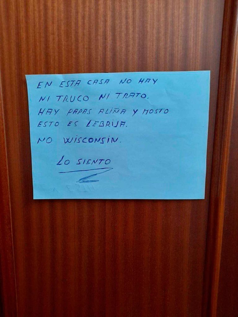 Un vecino de Lebrija ha dejado clara su postura ante este debate y, para que nadie llame a su puerta con un «truco o trato» típico de la festividad en Estados Unidos, ha escrito a mano un cartel que no da lugar a equivocación: «En esta casa no hay ni truco ni trato. Hay papas aliñá y mosto. Esto es Lebrija. No Wisconsin. Lo siento»