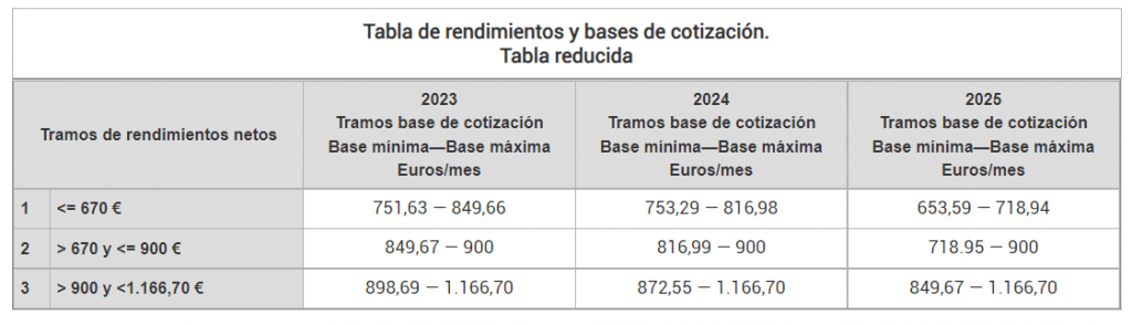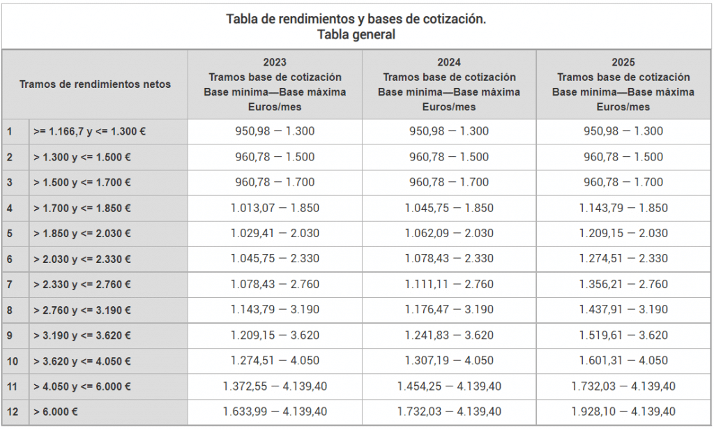 Partiendo del promedio mensual de estos rendimientos netos anuales, se seleccionará la base de cotización que determinará la cuota a pagar en función de las siguientes tablas, divididas entre los diferentes tramos de rendimientos netos (en promedio mensual) que se encuentren por debajo o por encima de los 1.166,70 euros.
