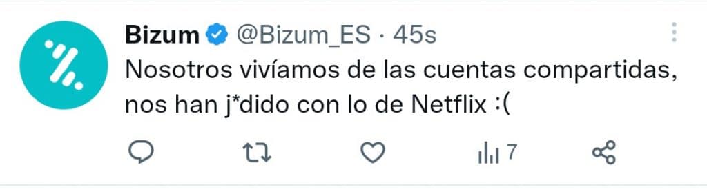 Este es el tweet con el que amanecía el pasado 10 de febrero la cuenta oficial de Bizum. Parece ser que no le ha sentado demasiado bien la decisión que ha tomado Netflix, aún así se puede apreciar un cierto humor en el tweet, ya que se sobreentiende que la plataforma de streaming no es el principal sustento de Bizum. El tono jocoso y divertido del tweet acompañado de esa carita triste no ha dejado indiferente a nadie.