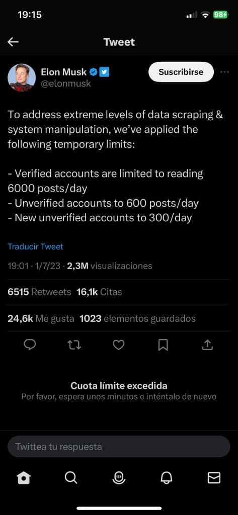 El dueño de Twitter, Elon Musk, ha anunciado este sábado que limitará la lectura de tweets al 600 al día si la cuenta desde la que se interactúa no es verificada. Esto quiere decir que, al menos que se pague una suscripción a Twitter Blue, no se podrán leer más de 600 tweets al día. La medida, según Musk, será temporal «para abordar niveles extremos de extracción de datos y manipulación del sistema», tal y como ha explicado a través de un tweet.