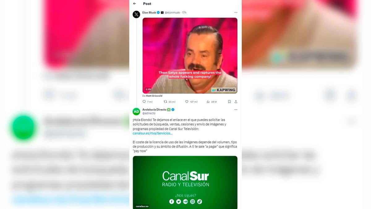 El programa de televisión de Canal Sur le ha indicado amablemente a Musk que si quiere utilizar contenido propiedad de la cadena, puede encontrar «solicitudes de búsqueda, venta, cesiones y envío de imágenes y programas». A continuación, en el mismo mensaje, le proporcionan un enlace a través del cual consultar dichas solicitudes.
