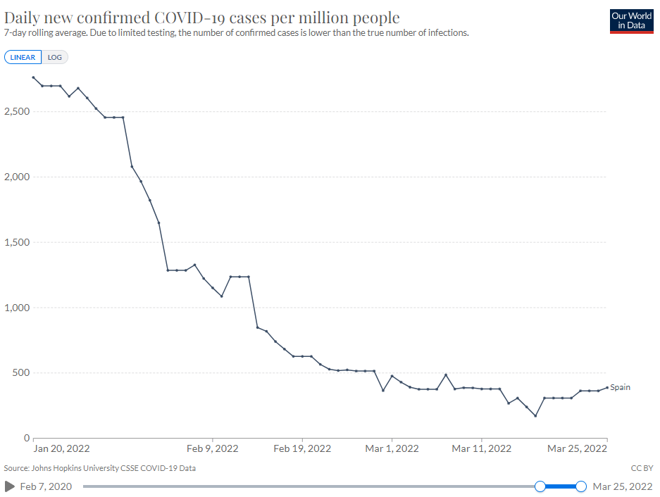 Tras una 6ª ola extraordinaria por volumen de contagios y tras un descenso relativamente rápido, la transmisión en España parece estancada en torno a cifras de incidencia acumulada en 14 días superiores a los 400 casos notificados por 100.000 habitantes. Son cifras altas. Bastante altas. Además, con la actual estrategia de «testado», las cifras de casos reales serán muy superiores a las notificadas.