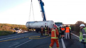 Restablecido al tráfico la A-49 en Bonares tras volcar un camión con gas butano
