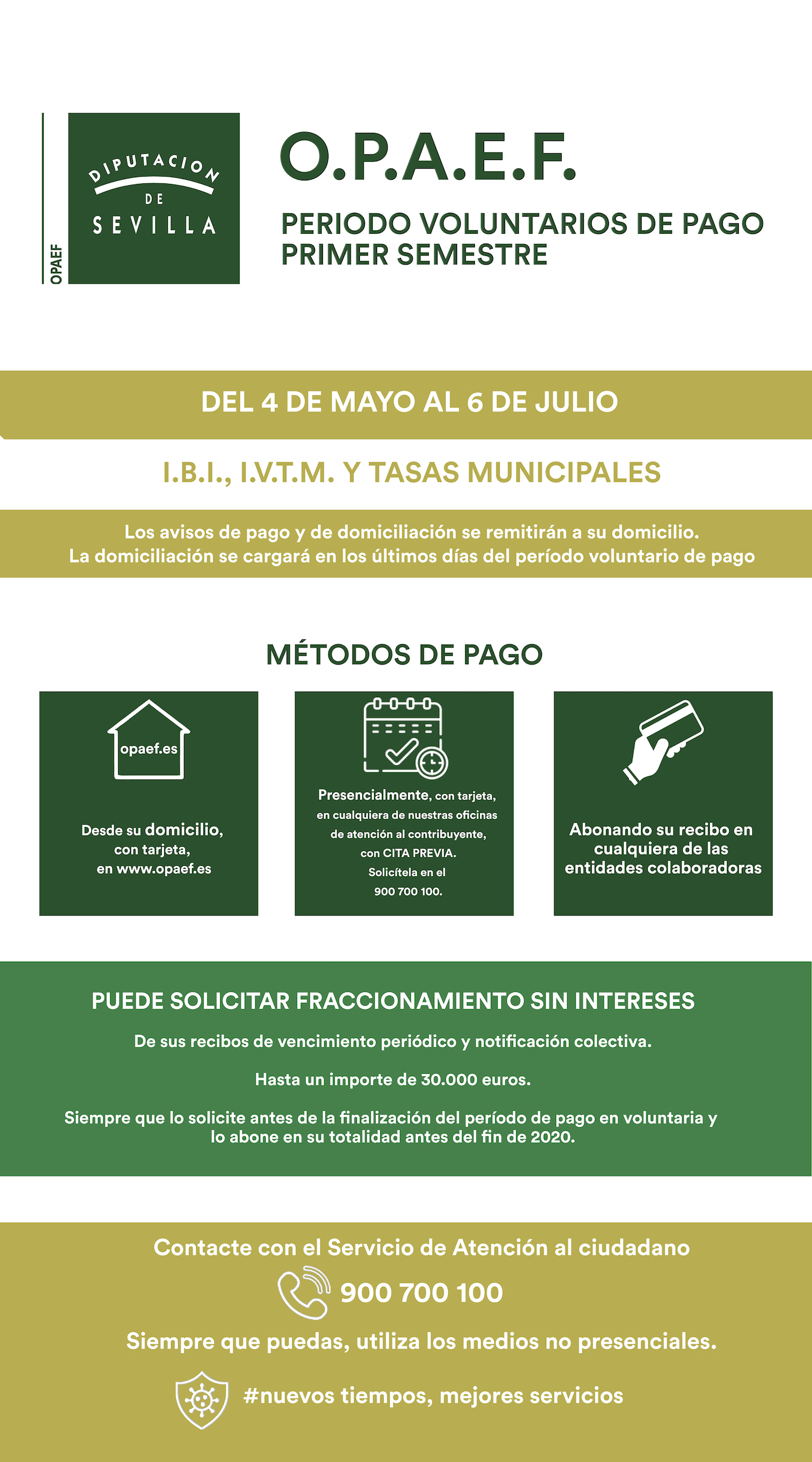 Como consecuencia de la declaración del Estado de Alarma, el Presidente de la Diputación y del OPAEF, mediante Resolución nº 332/2020, de 20 de marzo, publicada en BOP de Sevilla nº 70, de 25 de marzo, adoptó una serie de medidas en el ámbito de la aplicación de los tributos cuya gestión haya sido delegada en la Diputación Provincial, a través del OPAEF, con objeto de minimizar el impacto fiscal que, entre ciudadanos y empresas, pudiese conllevar la atención de sus obligaciones tributarias durante la vigencia del Estado de Alarma.