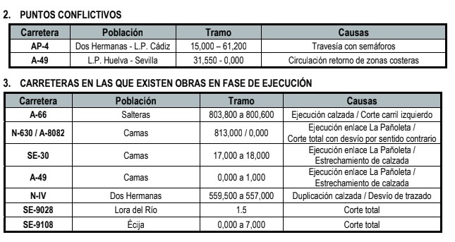 Por su parte, los puntos conflictivos y las carreteras en las que existen obras en fase ejecución en Sevilla son: