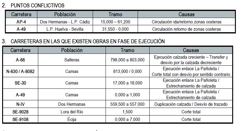 En la provincia de Sevilla, los días y horas de mayor intensidad de tráfico en las carreteras SE-30, A-66, A-49, A-92, A-4, N-IV y AP-4, son: