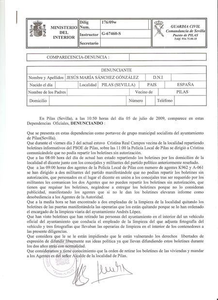 Según informa el partido socialista, concretamente en la jornada del domingo, sus concejales junto a varios militantes se encontraban buzoneando por las calles de la localidad. Mientras repartían los boletines apareció la Policía Local, que según dicen los socialistas, siguiendo órdenes del Alcalde trataron de impedir que continuaran con el reparto acusándolos de falta de autorización. Ante esta situación el portavoz del PSOE en el Ayuntamiento de Pilas, Jesús María Sánchez, ha declarado que “El reparto se viene haciendo desde hace dos años y medio con absoluta normalidad y nunca nos han solicitado autorización”.