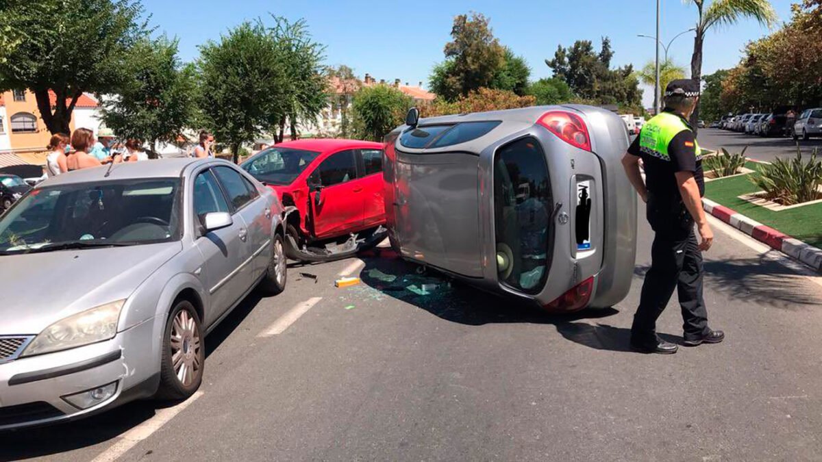 La Policía Local de Tomares ha procedido este jueves al corte del tráfico en el municipio por el vuelco de un vehículo. El accidente se habría producido por un despiste de la conductora, de 23 años, y tras golpear a otro automóvil que se encontraba estacionado.