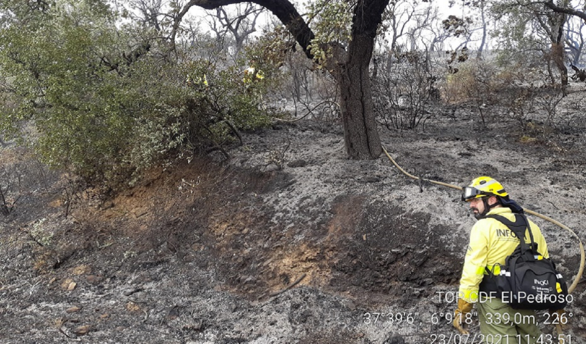 El servicio para la extinción de incendios forestales en Andalucía ha movilizado a través de su Centro Operativo Provincial a medio centenar de profesionales, dos vehículos pesados de extinción y un helicóptero pesado bombardero.