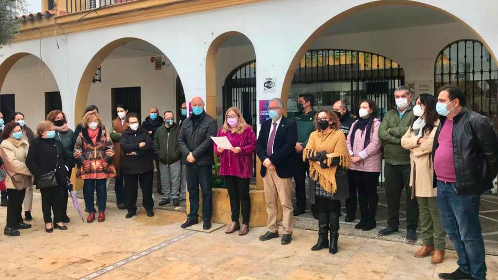 El equipo de gobierno, grupos políticos con representación en el Ayuntamiento y asociaciones y colectivos se han unido hoy en la fachada del Ayuntamiento de Écija para llevar a cabo un minuto de silencio en homenaje a las víctimas de la violencia de machista en la conmemoración del 25 de noviembre, Día Internacional contra la Violencia hacia las Mujeres.