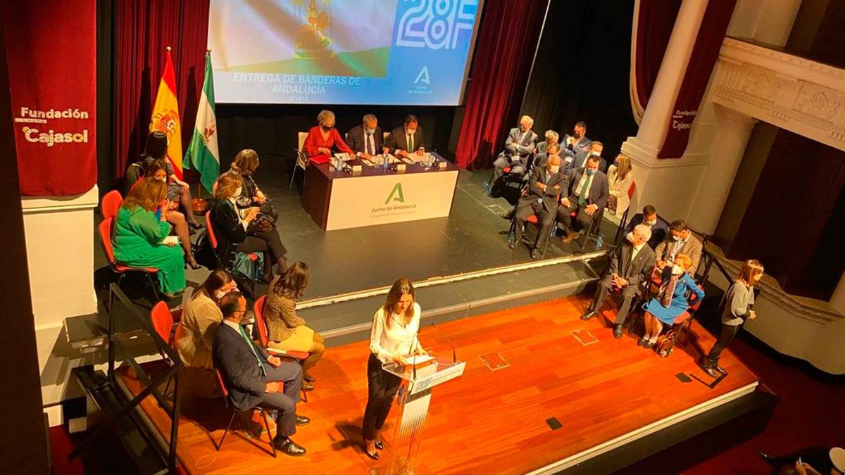 La Delegación del Gobierno de la Junta de Andalucía en Sevilla ha hecho entrega este viernes de las Banderas de Andalucía de la provincia. La Sala Chicarrerros de la Fundación Cajasol ha acogido este acto donde han estado presentes tanto el delegado de la Junta en Sevilla, Ricardo Sánchez, como el consejero de Economía, Rogelio Velasco, y la consejera de Cultura, Patricia del Pozo.