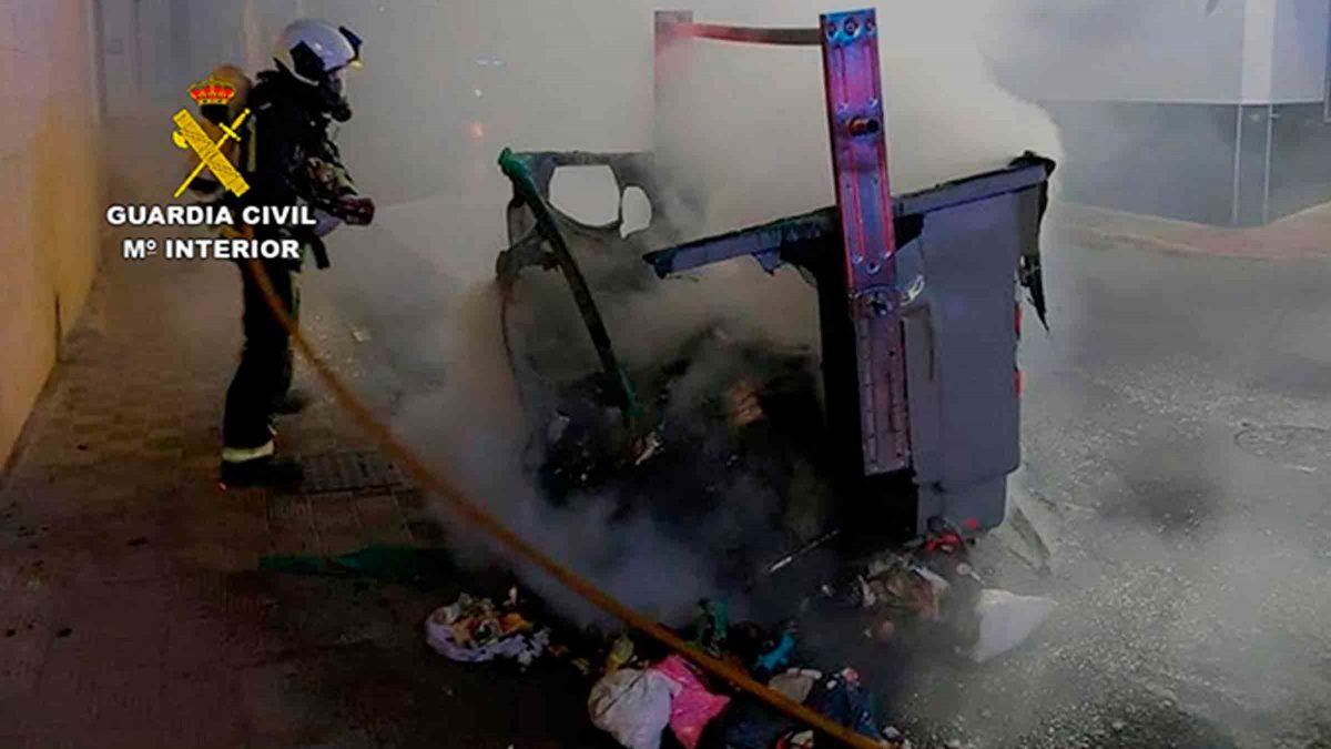 La Guardia Civil ha detenido a un joven de 18 años y a un menor por quemar contenedores repetidamente en la localidad de Utrera. Tras varias denuncias por parte de los vecinos y una estrecha colaboración con la Policía Local del municipio, los agentes consiguieron interceptar a los autores del delito cuando huían en una motocicleta. Se les acusa, además, de robo con violencia por la sustracción de una cámara de seguridad que les había grabado cometiendo los delitos.
