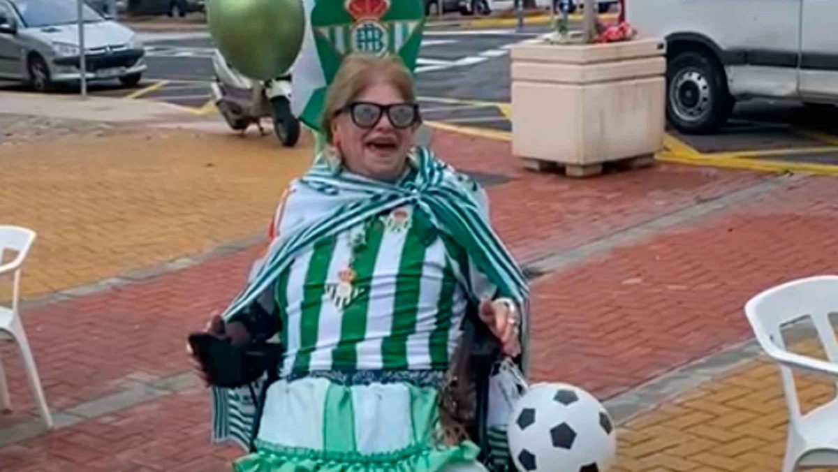 Vestida con un traje de flamenca verde y blanco y con una camiseta del equipo, se pasea por la localidad sevillana en su silla de ruedas totalmente decorada para la ocasión con globos verdes, una bandera a su espalda y una bandera con el escudo del Betis.