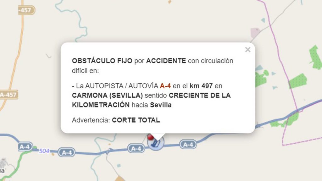 Un triple accidente en el kilómetro 497, sentido creciente, de la A-4 a su paso por Carmona, ha sido el causante de que este tramo de carretera haya quedado completamente cerrado al tráfico. Así lo ha informado Emergencias 112 Andalucía, a través de la Dirección General de Tráfico (DGT).