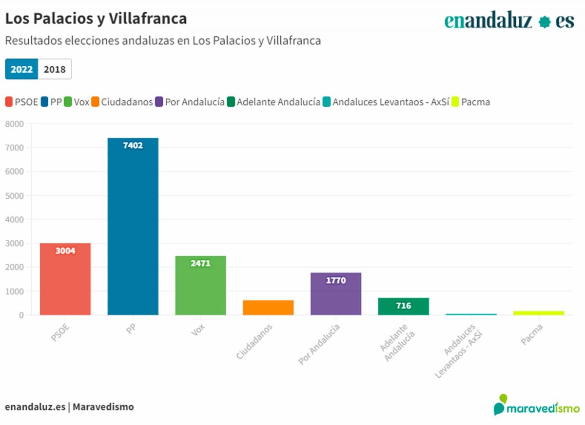 Resultados elecciones andaluzas | Los Palacios y Villafranca | Con el 100% de escrutinio, el PP ha ganado las elecciones andaluzas en Los Palacios y Villafranca, con 7402 votos y un porcentaje del 44,34%, casi 30 puntos más que el segundo. El PSOE ha logrado el 17,99% de los votos y 3004 votos, seguido de Vox, que ha cosechado 2471, con un porcentaje de voto del 14,80%.