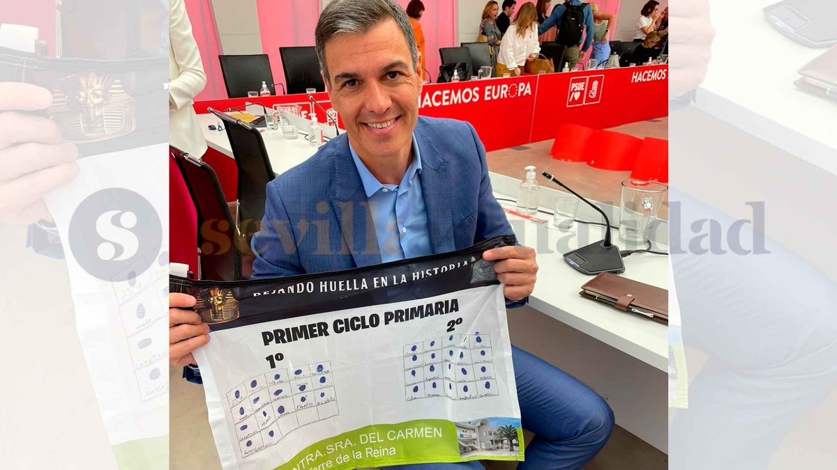 El presidente del Gobierno, Pedro Sánchez, ha sido el último en sumarse al reconocimiento que entidades públicas y personalidades han realizado del trabajo sobre Egipto llevado a cabo este curso en el CEIP Nuestra Señora del Carmen de Torre de la Reina (Guillena) bajo el título ‘Tocando la historia’. Este jueves ha enviado a los responsables del proyecto una foto en la que aparece con la ‘bandera viajera’ que ha recorrido los más importantes museos nacionales e internacionales en los últimos meses.