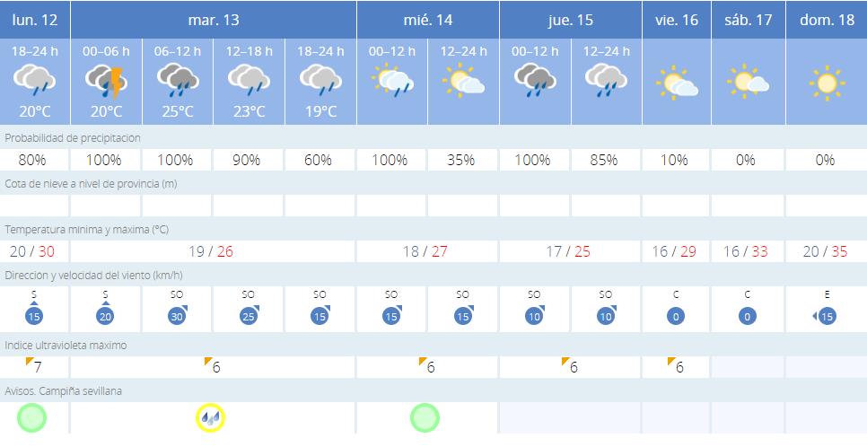 A partir de las 00:00 de este lunes, se activa en Sevilla un aviso amarillo por lluvias. Según pronostica la Agencia Estatal de Meteorología (AEMET) desde la medianoche de este lunes hasta las 12:00 de este martes hay un 100% de probabilidades de precipitaciones y se espera que se registren hasta 15 milímetros por hora.
