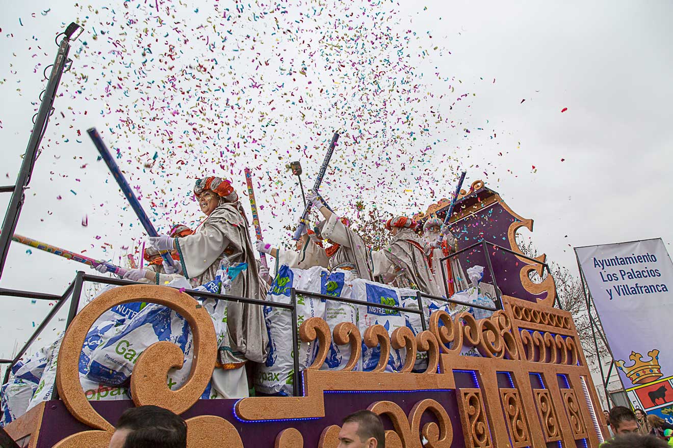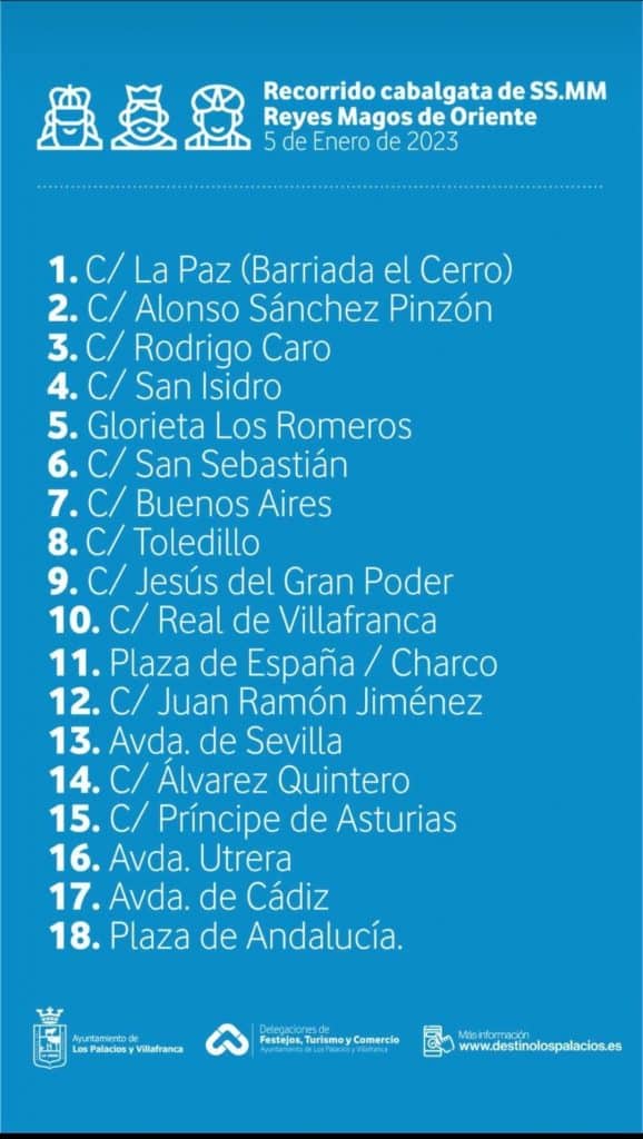 El cortejo de los Reyes Magos saldrá de la calle La Paz, en la barriada del Cerro, y pasará por la calle Alonso Sánchez Pinzón, calle Rodrigo Caro, calle San Isidro, Glorieta Los Romeros, calle San Sebastián, calle Buenos Aires, calle Toledillo, calle Jesús del Gran Poder, calle Real de Villafranca, Plaza de España, calle Juan Ramón Jiménez, Avenida de Sevilla, calle Álvarez Quintero, calle Príncipe de Asturias, Avenida de Utrera, Avenida de Cádiz y Pla