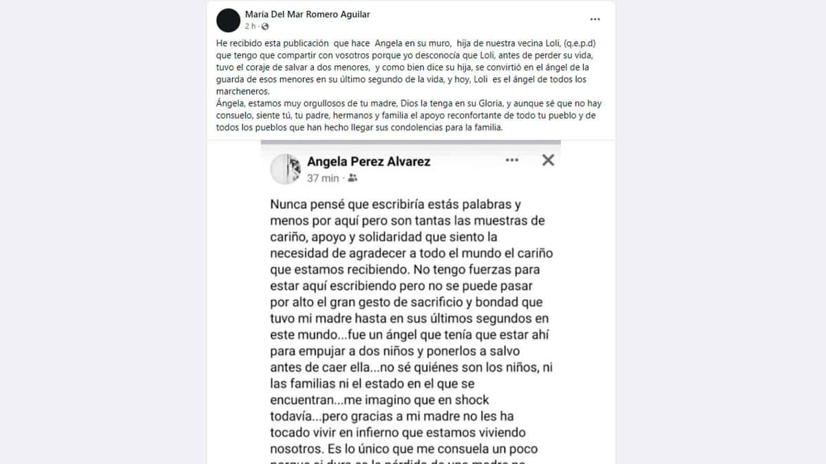 La alcaldesa de Marchena, María del Mar Romero Aguilar, ha compartido en su perfil de Facebook un emotivo mensaje que ha escrito Ángela Pérez, hija de Loli, la mujer que murió el pasado 5 de enero durante la Cabalgata de los Reyes Magos de Marchena.