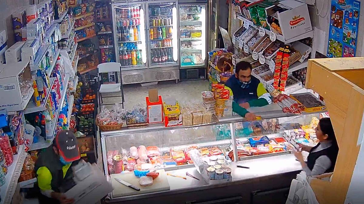 La dependienta desaparece de la escena mientras que el atracador consigue su propósito y sale huyendo, junto al otro hombre, del establecimiento, portando la caja registradora y tirando los productos que se interponían en su camino.