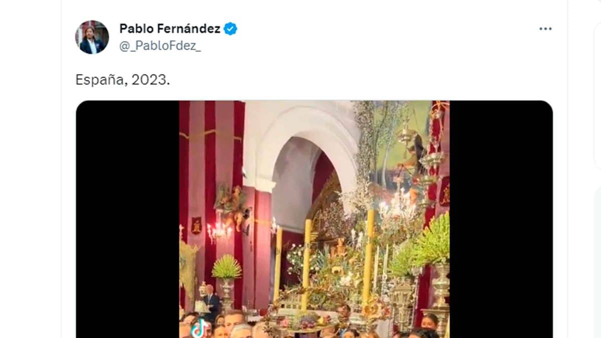 En el post en cuestión, Fernández escribe «España, 2023» y adjunta un vídeo de la cuenta de Tik Tok @elcapillita_de_tiktok en el que se ve el traslado de la Divina Pastora al paso, que fue procesionada por la localidad sevillana el pasado 8 de septiembre.