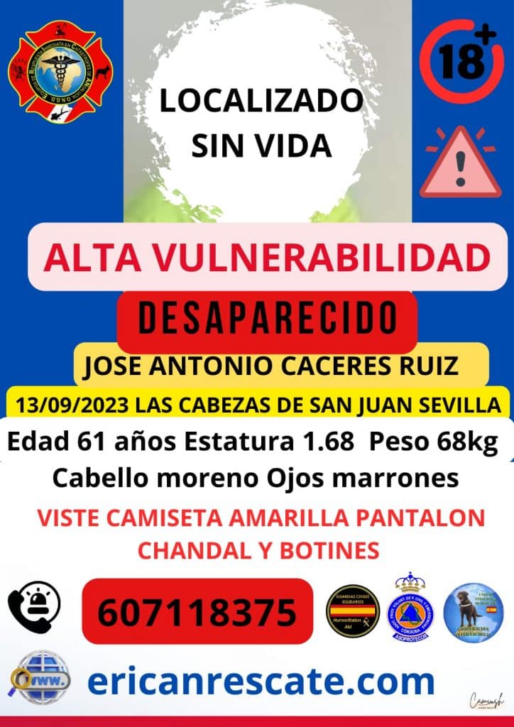 Un hombre de 61 años que llevaba desaparecido desde el pasado 13 de septiembre en Las Cabezas de San Juan ha sido localizado sin vida, según ha informado ericanrescate. El desaparecido, que respondía al nombre de José Antonio Cáceres Ruiz, tenía 61 años, medía 1,68 metros y pesaba 68 kilos. Tenía el cabello moreno y los ojos marrones, y en el momento de su desaparición vestía una camiseta amarillo, un pantalón de chándal y zapatillas de deporte.