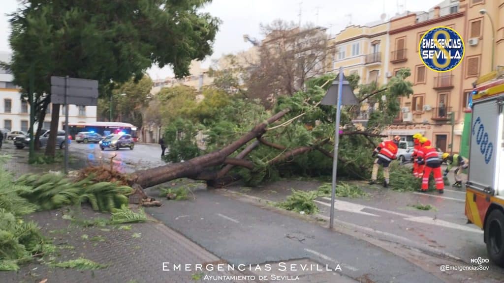 La borrasca Bernard tiene en aviso amarillo a toda la provincia de Sevilla y en aviso naranja la zona de la Sierra Sur, donde se están registrando rachas de viento de hasta 90 kilómetros por hora. La citada borrasca está provocando incidencias en muchos puntos, desde anegaciones en pasos subterráneos hasta árboles de grandes dimensiones arrancados de cuajo.