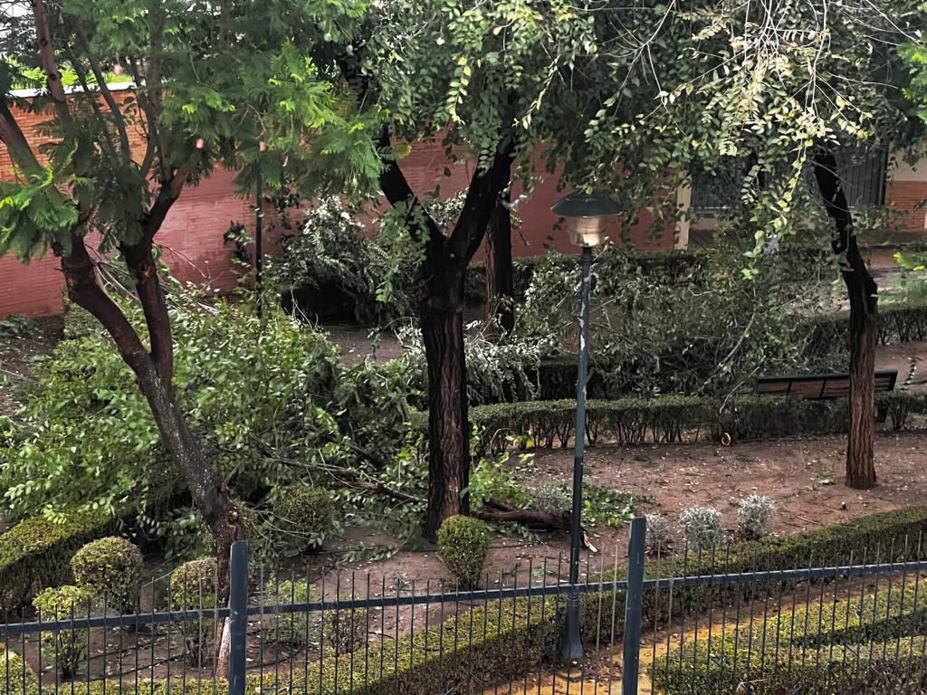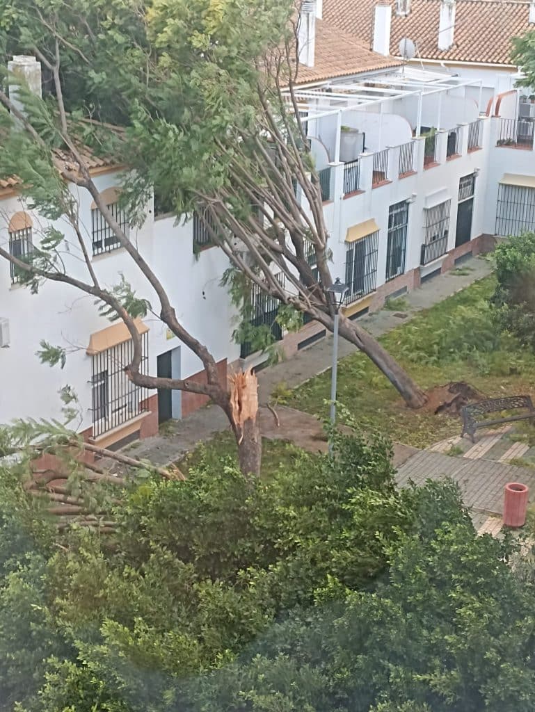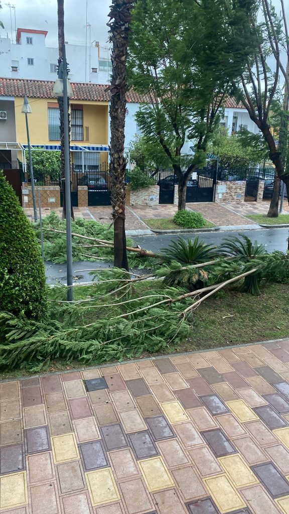 En Alcalá de Guadaíra destacan incidencias en el Parque Centro y la zona del Campo de las Beatas, donde los árboles han sufrido el azote de la borrasca y algunos han sido arrancados de cuajo.