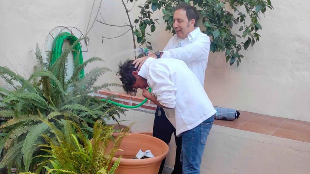Son momentos cofrades que pasan de padres a hijos. José Antonio Revilla, fundador de la primera cuadrilla de costaleros de la Hermandad de la Esperanza, este año volverá a bautizar a nuevos costaleros, echándoles un jarro de agua por la cabeza en el patio de la parroquia, unos minutos antes de salir.