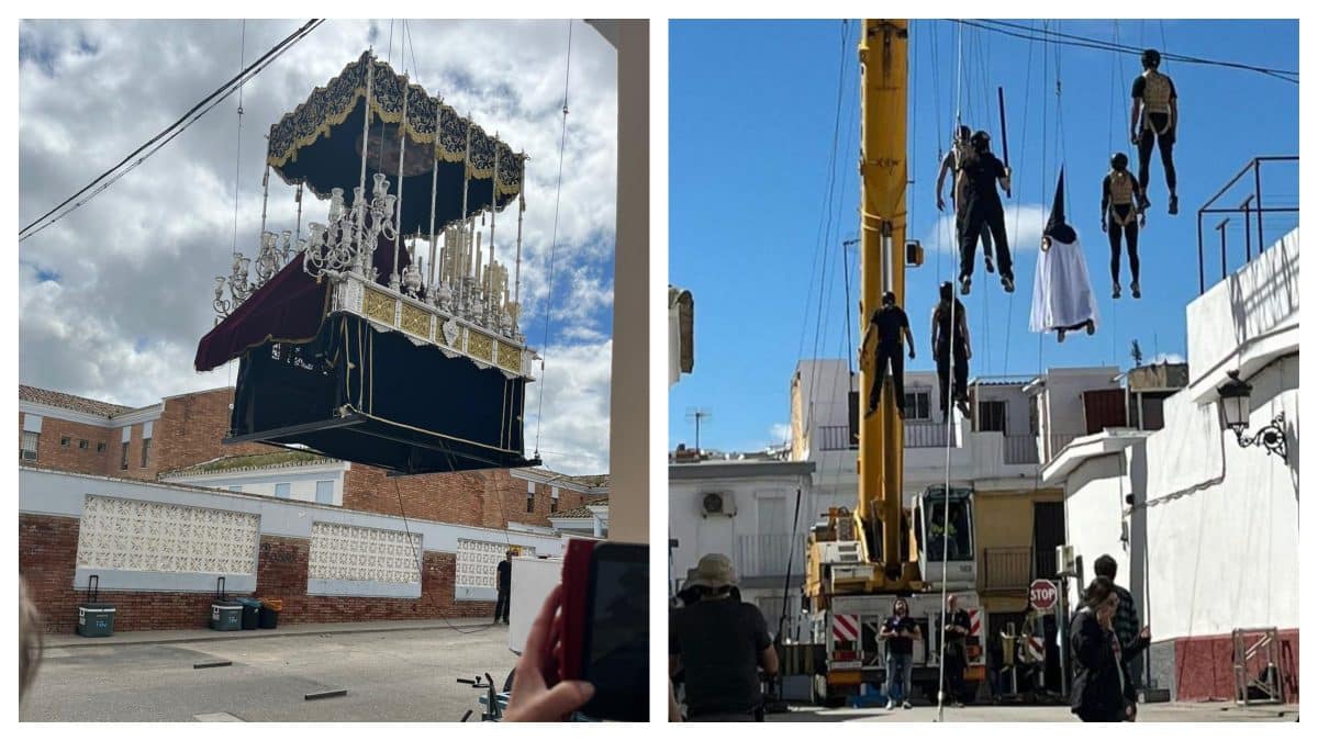 Las redes sociales se han inundado con imágenes sorprendentes del rodaje. Entre ellas, destaca el paso de palio de la hermandad del Soberano, que realiza su salida procesional en la tarde del Viernes Santo de Morón. Lo curioso es que este paso, adornado con las caídas que en su momento pertenecieron a la primitiva Virgen del Rosario, aparece suspendido en el aire por poleas. Una visión poco convencional que ha generado todo tipo de comentarios y reacciones entre los internautas.