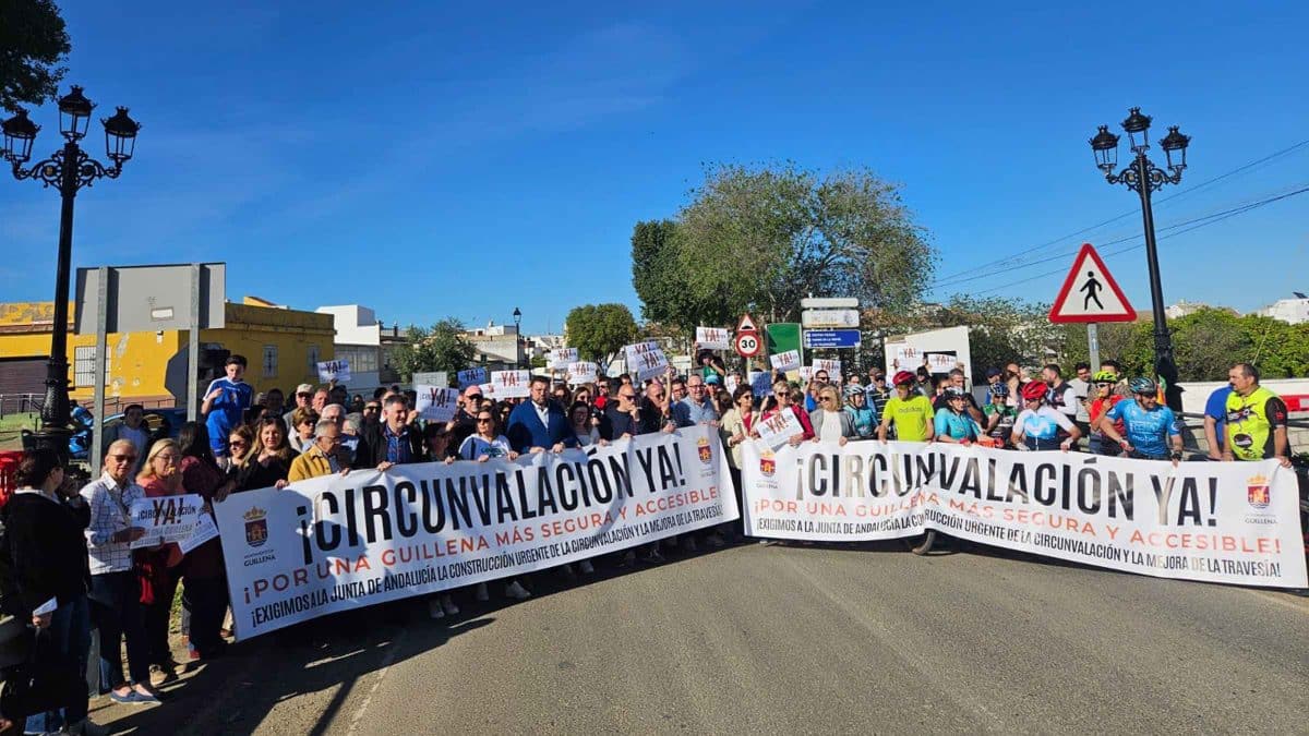 Más de un centenar de vecinos de Guillena se han concentrado la tarde de este martes para exigir a la Junta de Andalucía una circunvalación en el municipio y la mejora de la travesía de la carretera autonómica a su paso por la localidad, y lo han hecho a la entrada del municipio, sobre el puente del arroyo Galapagar.