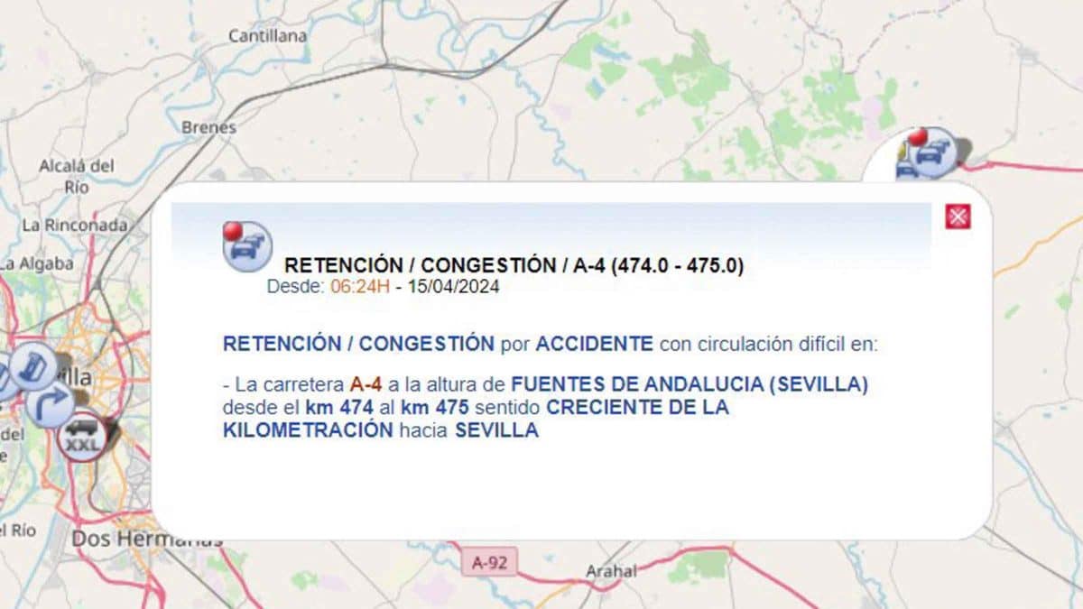 Según informa la Dirección General de Tráfico (DGT) en su página web, el corte afecta al carril en sentido Sevilla capital a la altura de kilómetro 475 de la A-4 y provoca retenciones en ambas direcciones.