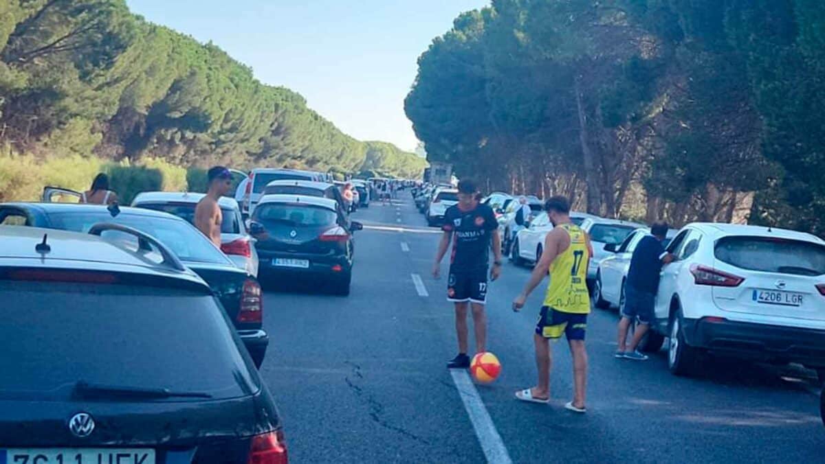 Los atascos son un misterio, nunca se sabe si durarán minutos u horas. El que tuvo lugar en la tarde de este domingo en la AP-4 entre Cádiz y Sevilla fue de los segundos, por lo que un grupo de personas se bajó de sus vehículos a echar un partidillo de fútbol en mitad de la carretera.