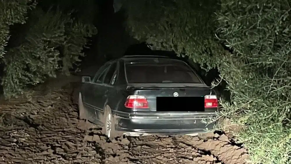 Según informa la Policía Local, el propietario de las tierras avisó a los agentes cuando escuchó el ruido del motor del coche al intentar sacarlo de un atasco. Debido a una avería en el sistema de riego de las tierras, la zona entre olivares en la que metieron el vehículo estaba encharcada y se quedó atrapado.