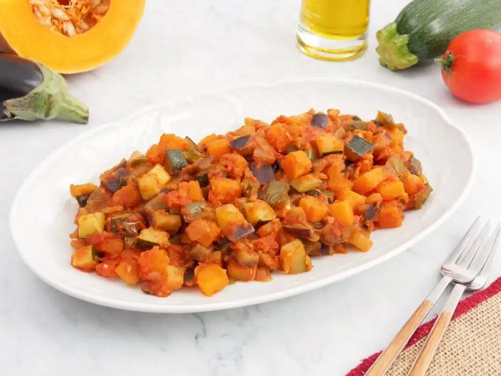 Pelar y cortar en trozos berenjenas, calabaza, pimientos, tomates y membrillo. Poner todo a cocer en una cacerola. Sofreír aparte, una sartén con aceite muy caliente, cebolla y tomates picados. El sofito de tomate se añade al resto y se sazona, se añaden unas gotas de vinagre y llevamos a ebullición. Cuando no lleva membrillo se le llama Boronía.