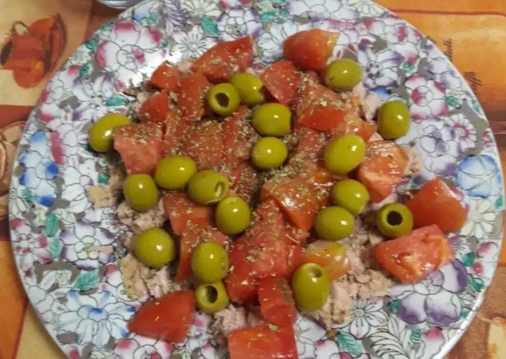 Tomates aliñados con aceitunas y aceite de oliva