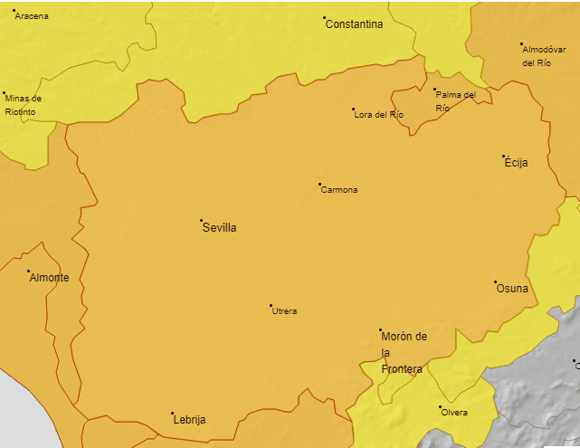 Los municipios de la provincia que se verán más afectados por este temporal serán Lora del Río, Écija, Osuna, Carmona, Utrera, Lebrija, Morón de la Frontera y la capital hispalense. La sierra norte se libra por poco y municipios como Constantina estarán en aviso amarillo en lugar de naranja.