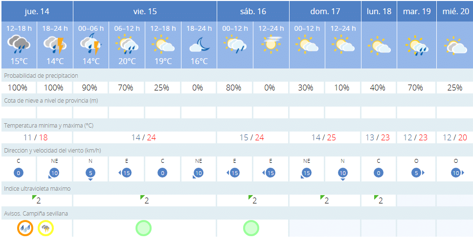 La Agencia Estatal de Meteorología ha elevado este jueves al aviso naranja también la Sierra Norte de Sevilla, con precipitaciones acumuladas de 30 litros por metro cuadrado en una hora. El aviso está vigente, de momento, hasta las 18:00 horas. Tan solo la Sierra Sur se encuentra bajo aviso amarillo, también hasta las 18:00 horas, y con previsión de 40 litros en 12 horas.