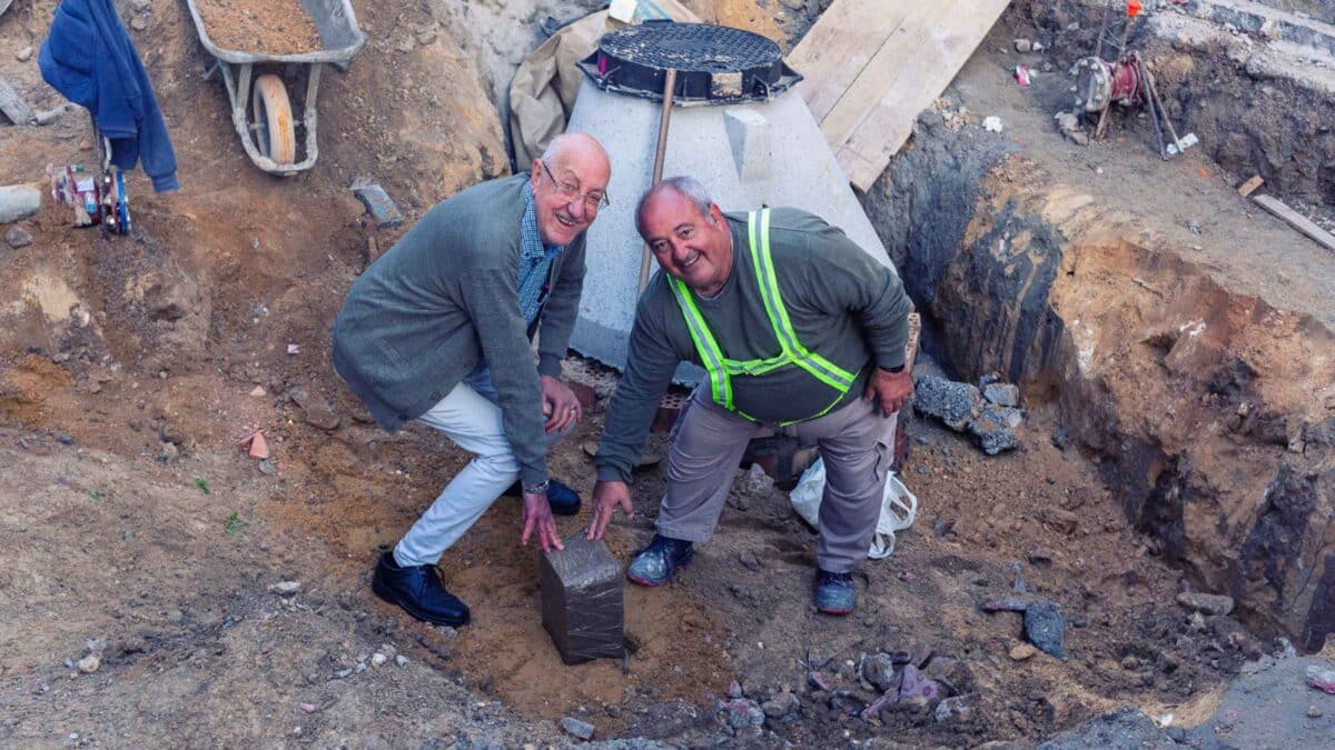 Manuel Castillo Arias de Reina junto con el encargado de obras en el momento de introducir la cápsula del tiempo. Carmen González García