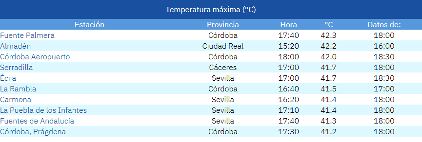 El intenso calor no ha sido exclusivo de Sevilla. En el conjunto del país, los valores más altos se han registrado en la provincia de Córdoba, donde Fuente Palmera lideró el ranking con 42,3 ºC, seguida de cerca por Almadén (Ciudad Real) con 42,2 ºC y el aeropuerto de Córdoba con 42,0 ºC.