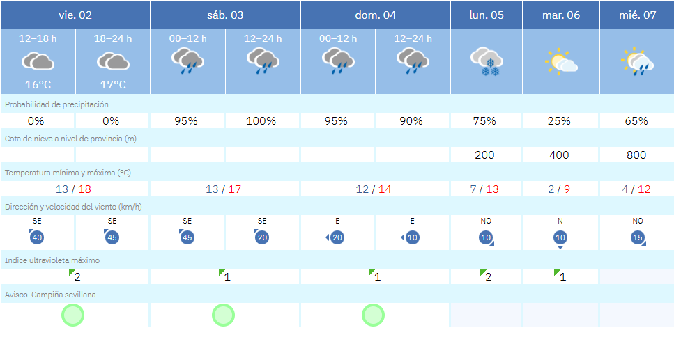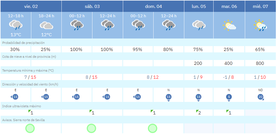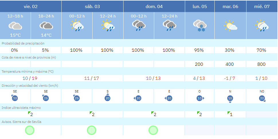 En la Sierra Sur de Sevilla, Pruna es otro de los municipios a vigilar con especial atención. Situado a 546 metros de altitud, presenta para el lunes una probabilidad de precipitación del 95 %, con temperaturas mínimas en torno a los 3 ºC y una cota de nieve fijada igualmente en los 500 metros.