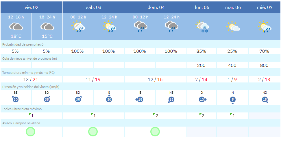 Montellano, en la Campiña sevillana y con una altitud de 269 metros, presenta para el lunes una probabilidad de precipitación del 85 %, con temperaturas mínimas en torno a los 7 ºC y una cota de nieve provincial igualmente muy baja.
